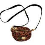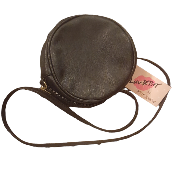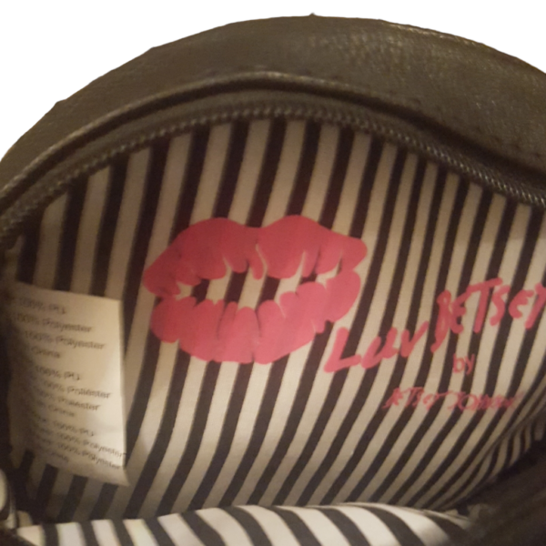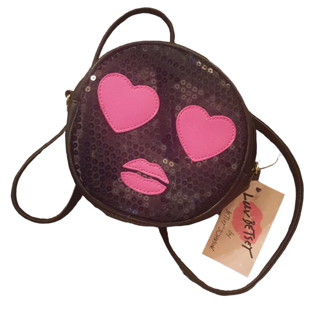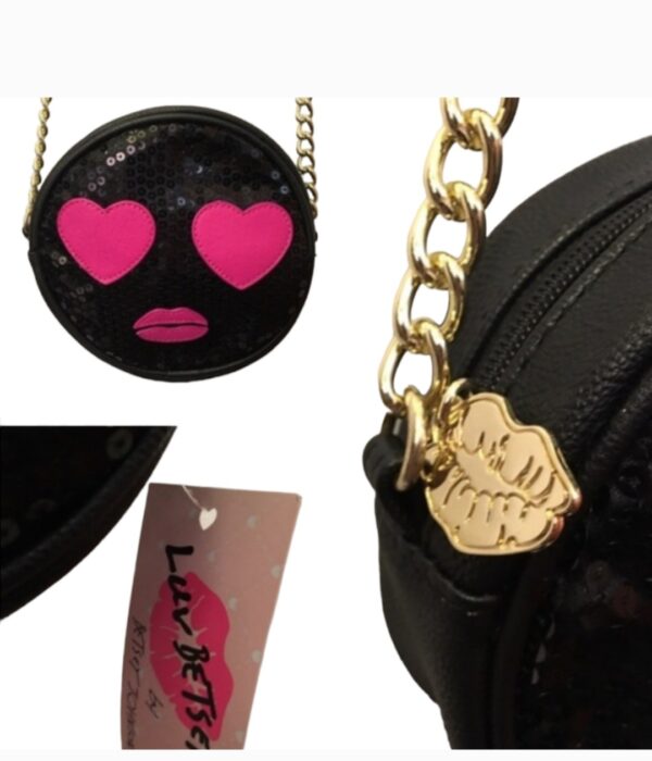Betsey Johnson’s black sequin round handbag features a vibrant hot pink smiley face and a secure zipper closure. This stylish piece includes a chic black faux leather strap and a striking black-and-white striped design with hot pink lips.
