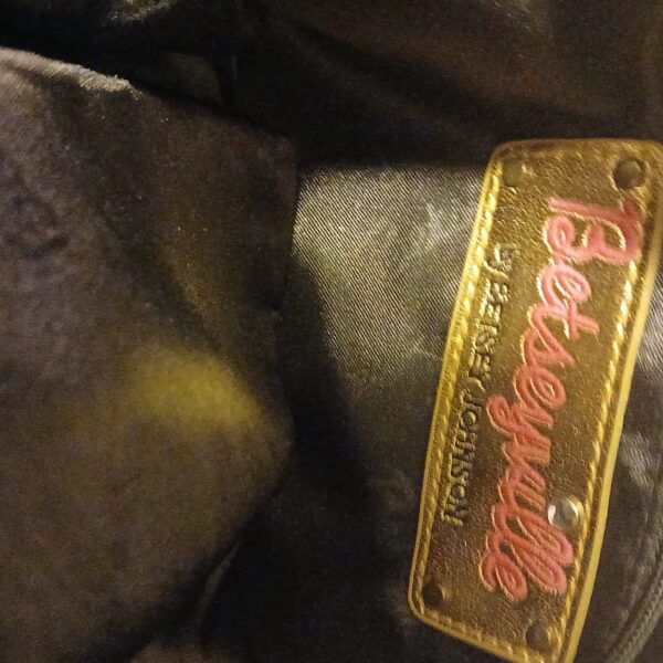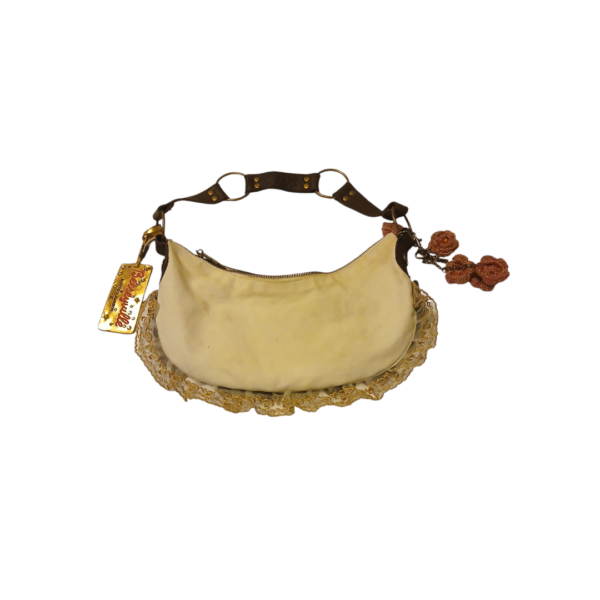 Betsey Johnson cream colored shoulder bag with ruffles, faux leather strap rosette  knit charm that hangs from the strap heart in the center with rhinestone  in the center.