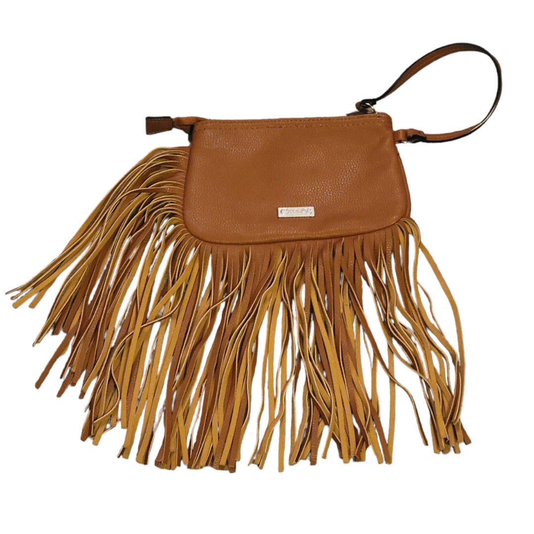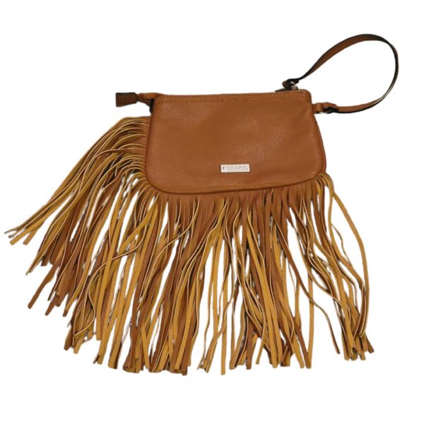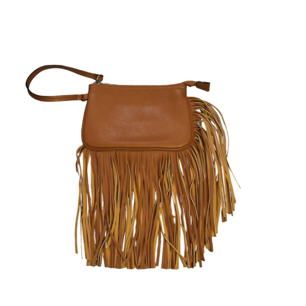 Tan fringe wristlet that zip with handle.