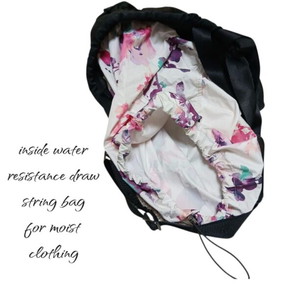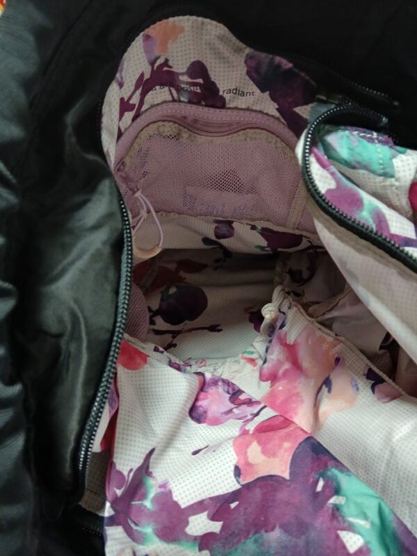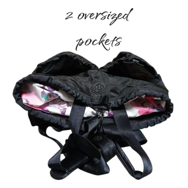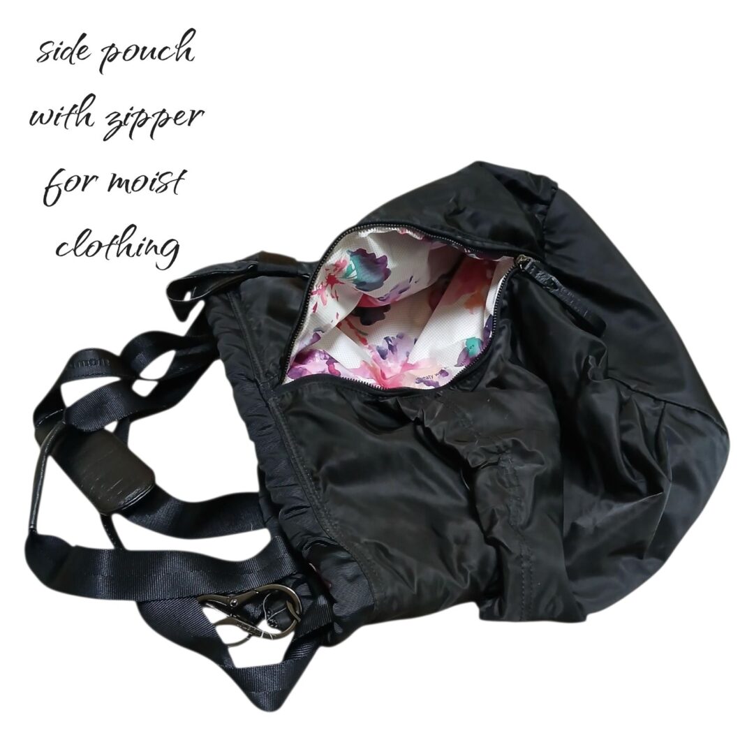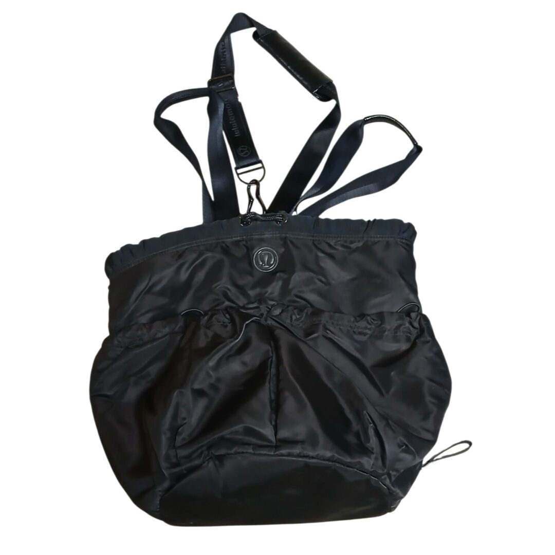 • Black yoga  tote bag  with 2 handles and a cross strap. Round with 2 large outer pockets that  zip. Large hidden pocket inside bag with a drawstring bag  that is water resistant. Outer body is nylon, measuring 15×13. No rips stains or tears.
